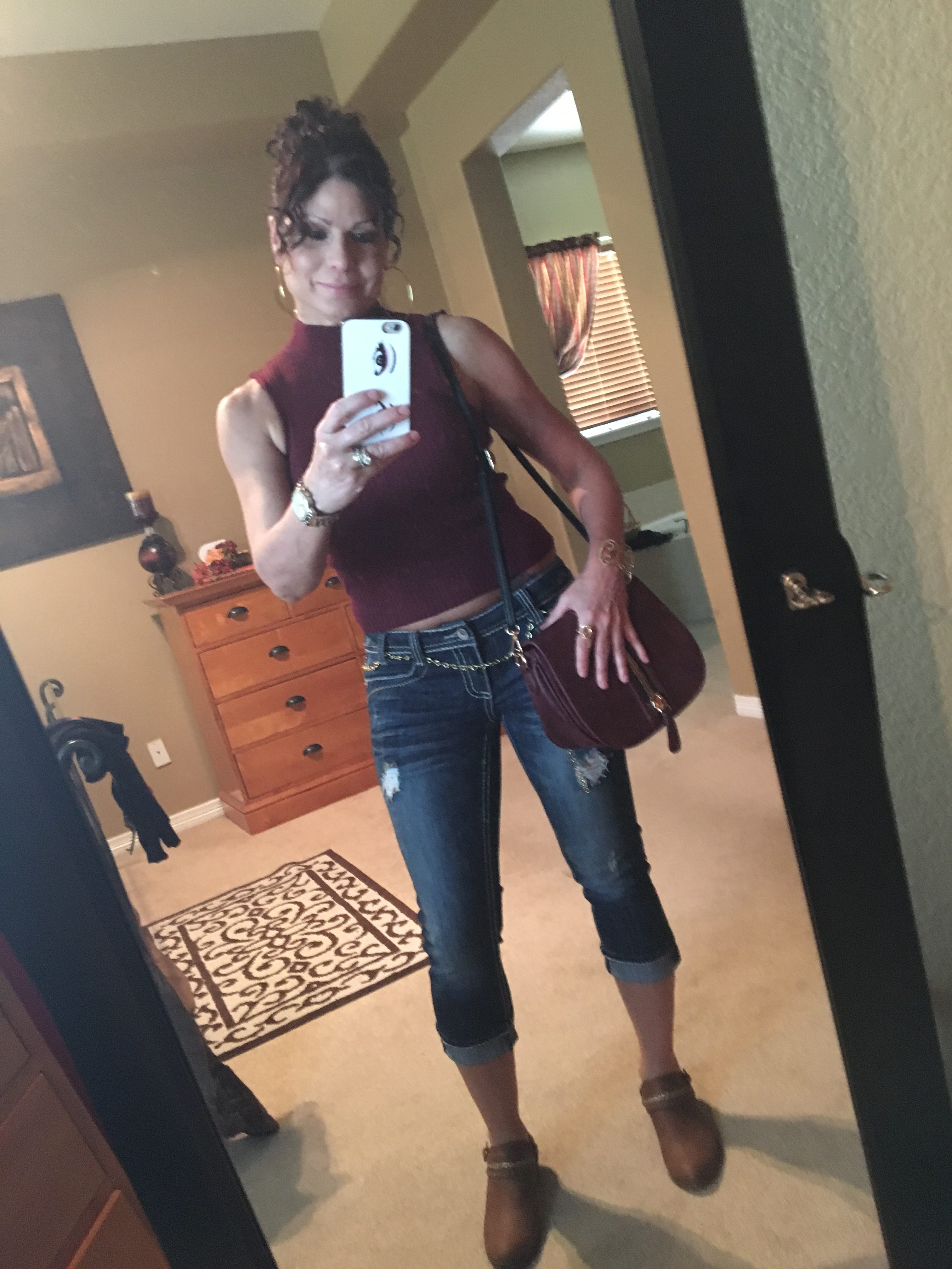 For this look I chose a sleeveless mock neck I purchased at #H&M and paired it with a pair distressed, dark washed capris jeans from #YMI. The booties I purchased at a #JCP sale and are from the brand Sugar. The camel bag is from #TJMax from the Brand Madison West. The chain belt I made using chain I purchased from a home improvement store and charm from the craft store.