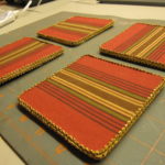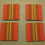 If you have old coasters you no longer use because they don’t match your décor, you may be able to turn them into a one of a kind piece you’ll be proud to showcase. For this project I’ll be using old foam coasters I found in a kitchen drawer. The supplies you’ll need include spray adhesive, a hot glue gun, fabric and decorative trim. Use fabric and trim that goes with your kitchen or home décor. Make sure the trim is the same width of the edges of the coaster. Use the coaster to cut the fabric to size. Then spray it with the adhesive. Place the fabric square over the coaster making sure all edges are lined up. Press on the fabric to adhere it to the coaster. Make sure the fabric is smooth. Allow time for the adhesive to dry. Cut the trim to fit around the edges of the coasters. Use a hot glue gun to attach the trim around the edges. When everything is dry, you’re ready to use and display your new stylish coasters. I stacked mine on an expensive miniature chair I bought at a thrift store, and I’m sure you’ll find other creative ways to display your one of a kind creation!